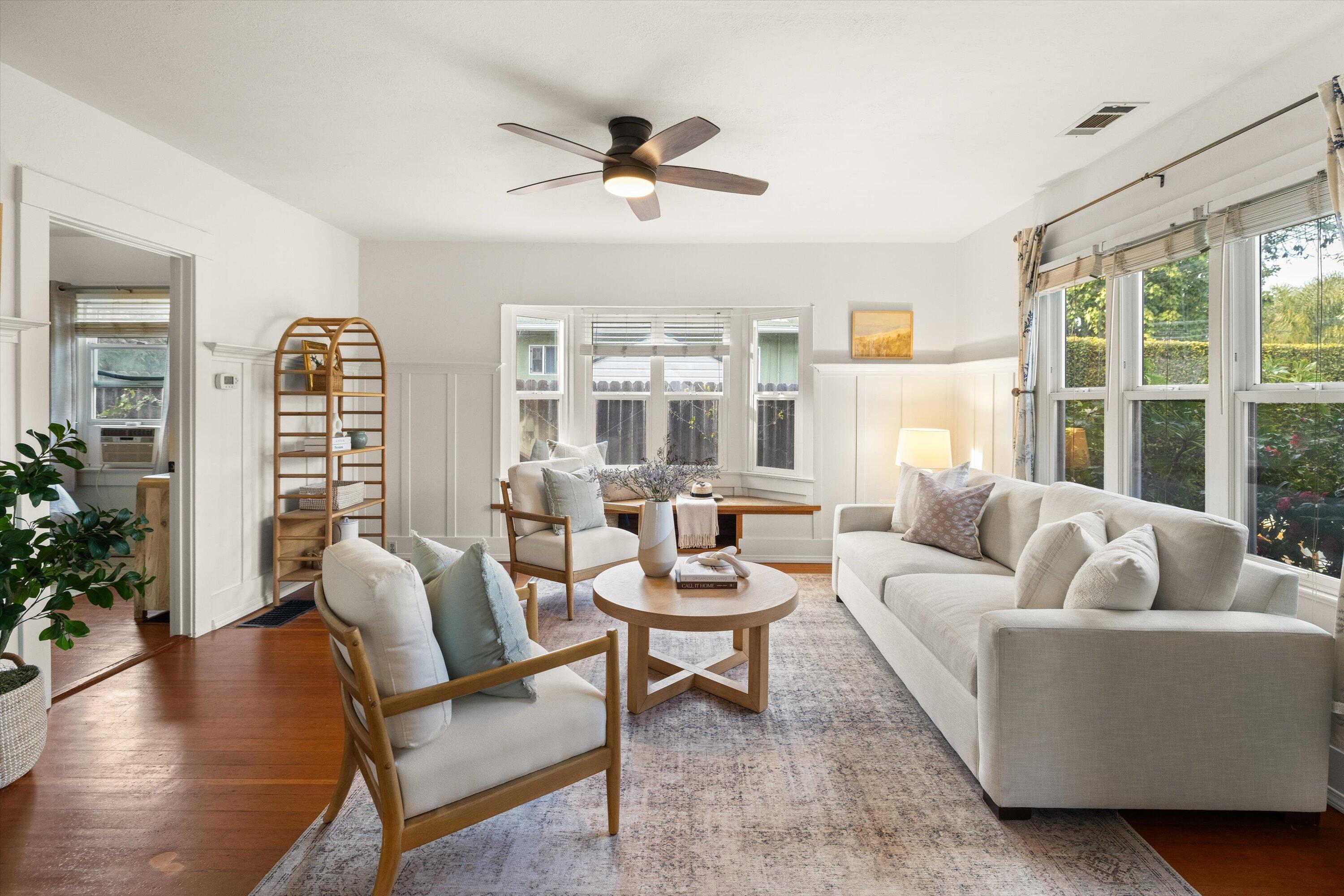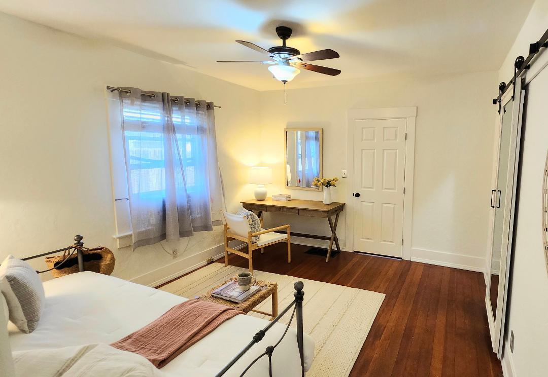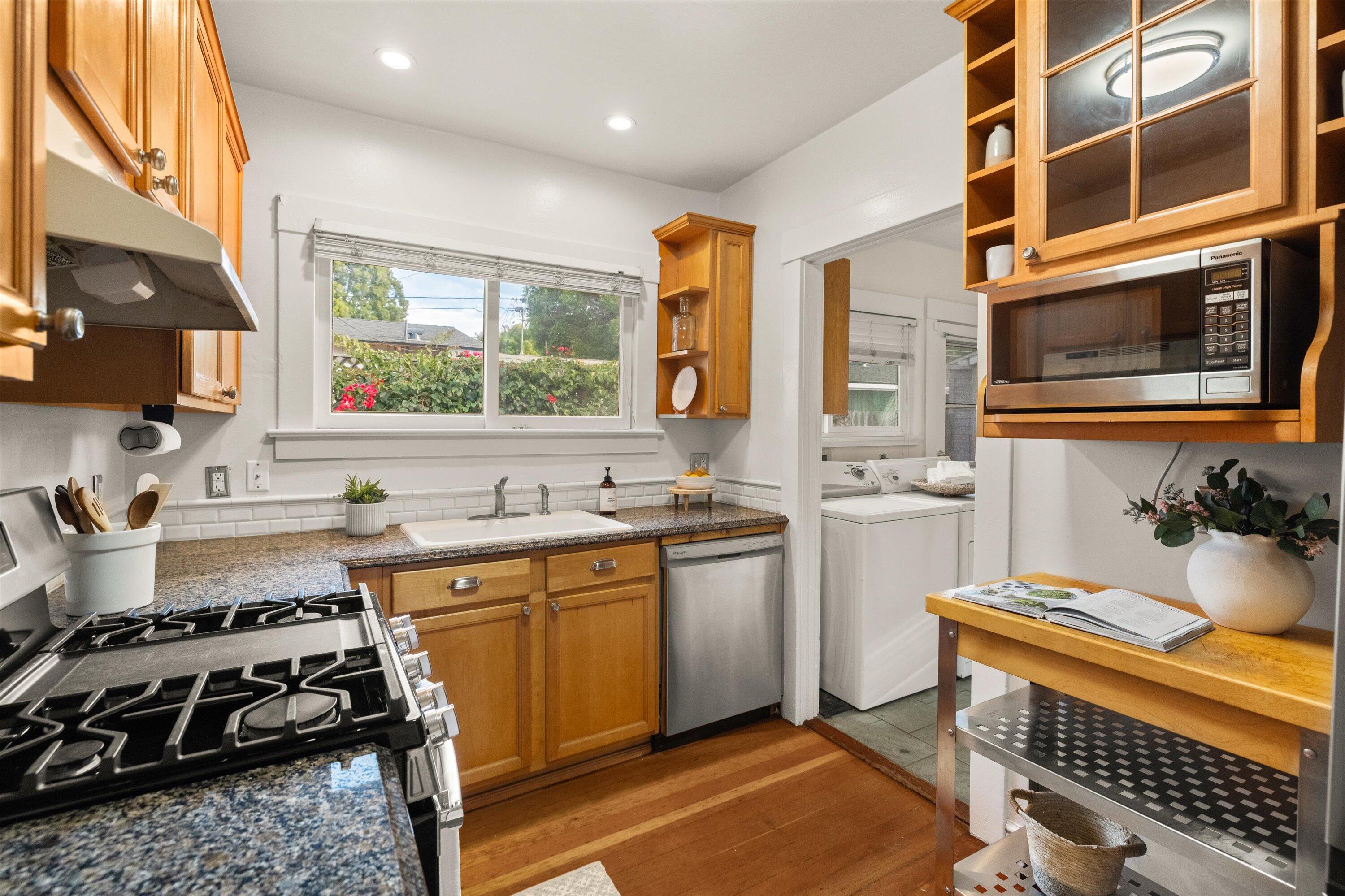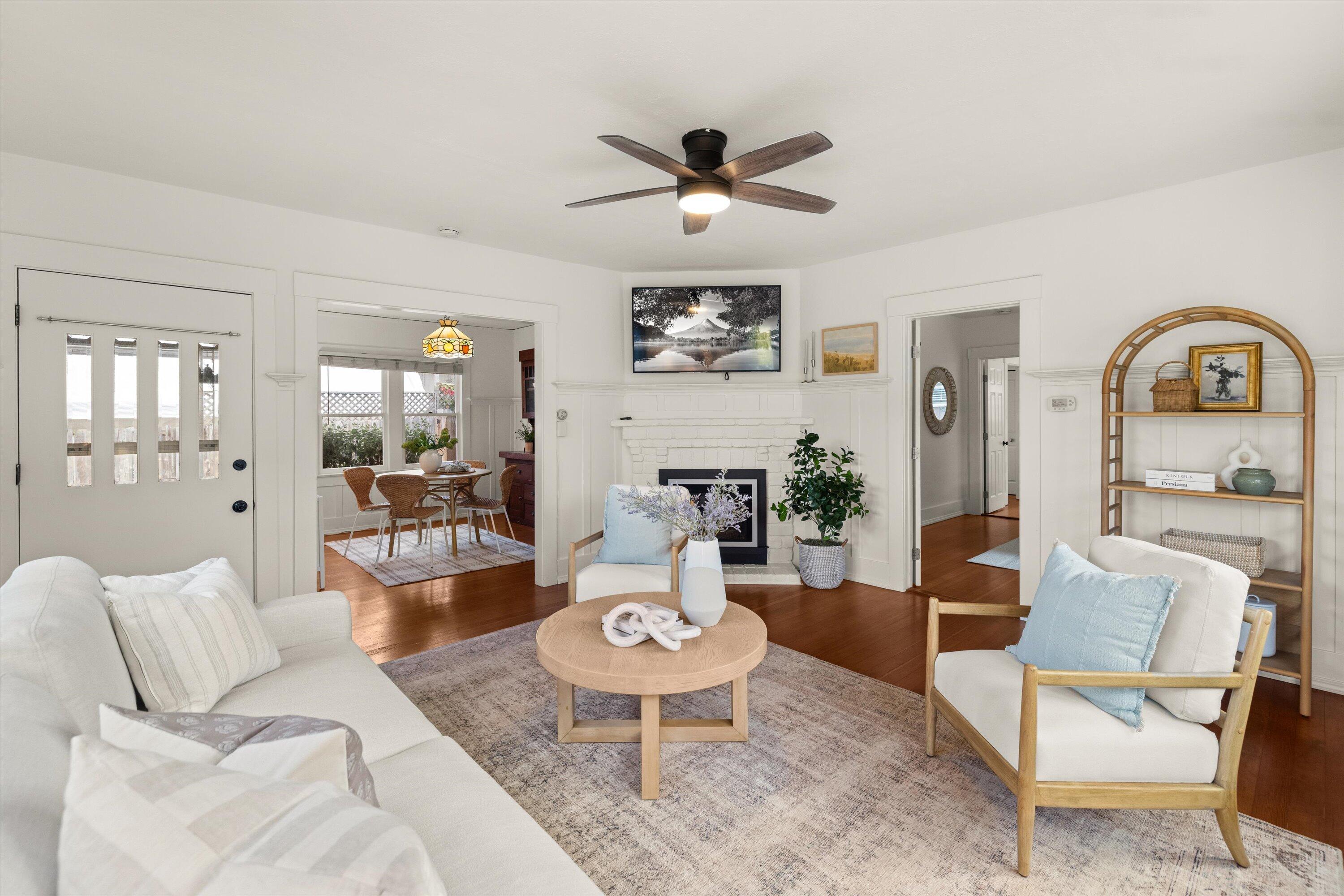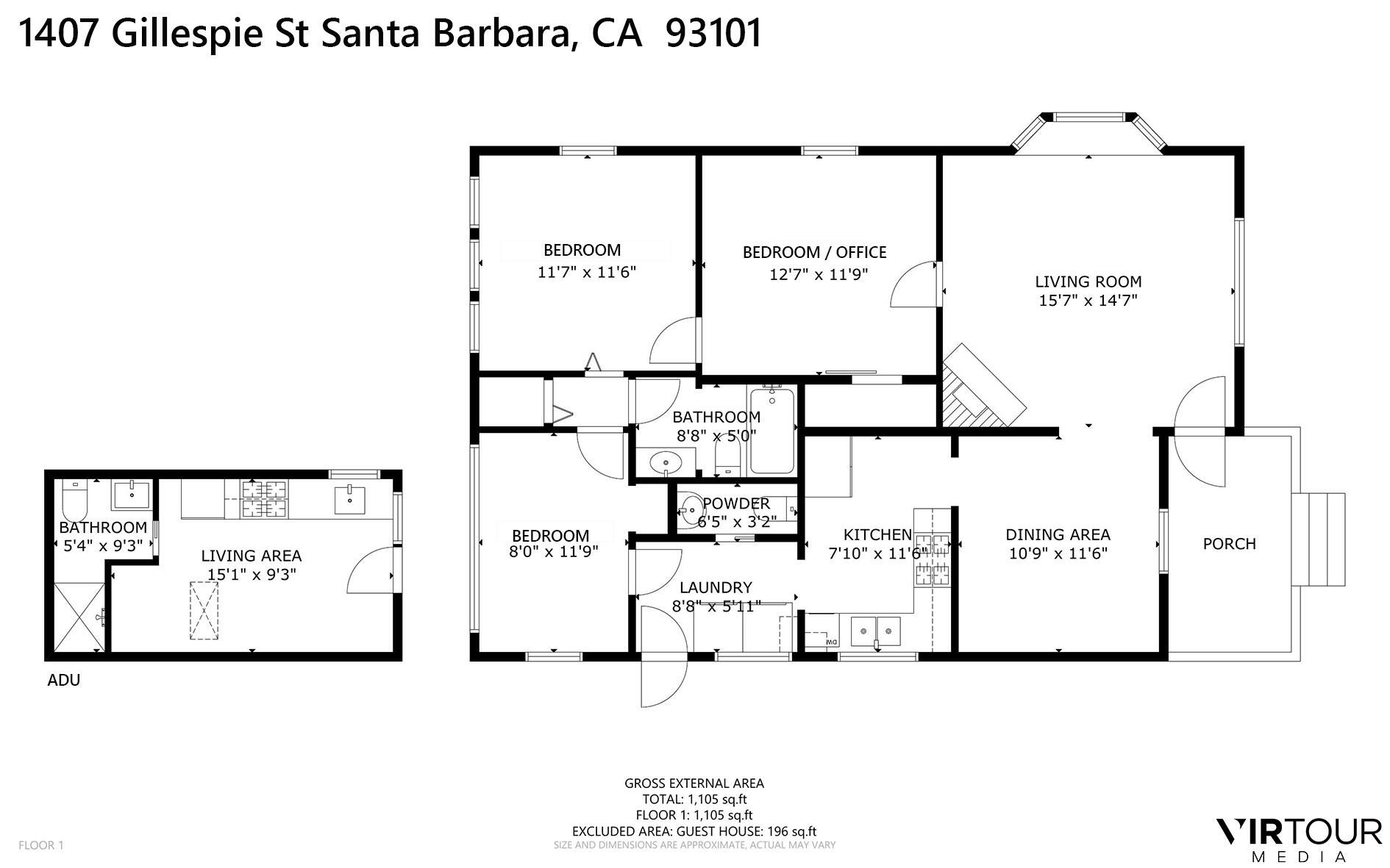 Step into this charming 1930's Craftsman-style bungalow with permitted studio ADU circa 2023, located on a quiet street on Santa Barbara's Westside. Offering the best of vintage appeal with valuable updates, this home is situated behind a beautiful privacy hedge and greets you with a classic front porch and ultra private front yard space. Features include three bedrooms; one of which could live as an office/den space, one and a half bathrooms, a formal dining room with original built-in buffet, inviting living room with lots of windows and a newer gas fireplace. Rich wood floors, a newer roof, tankless water heater, newer electric panel, new paint and citrus trees add to the highlights of the home. The detached, permitted studio ADU built in 2023 offers many options for use such as family or guest space, a private work space or as an income producing rental. Located at the end of the long driveway with ample parking, extra outdoor space and next to a gorgeous, giant palm tree, the studio ADU includes a bathroom with shower, generous kitchen area, a built-in murphy bed, desk space and all the trimmings to move right in! Located in the central part of Santa Barbara's popular Westside with recent pedestrian and bicycle improvements, 1407 Gillespie has amazing access to the heart of Santa Barbara - just minutes to Downtown SB, The Mesa, beaches, parks, shopping, dining and more.