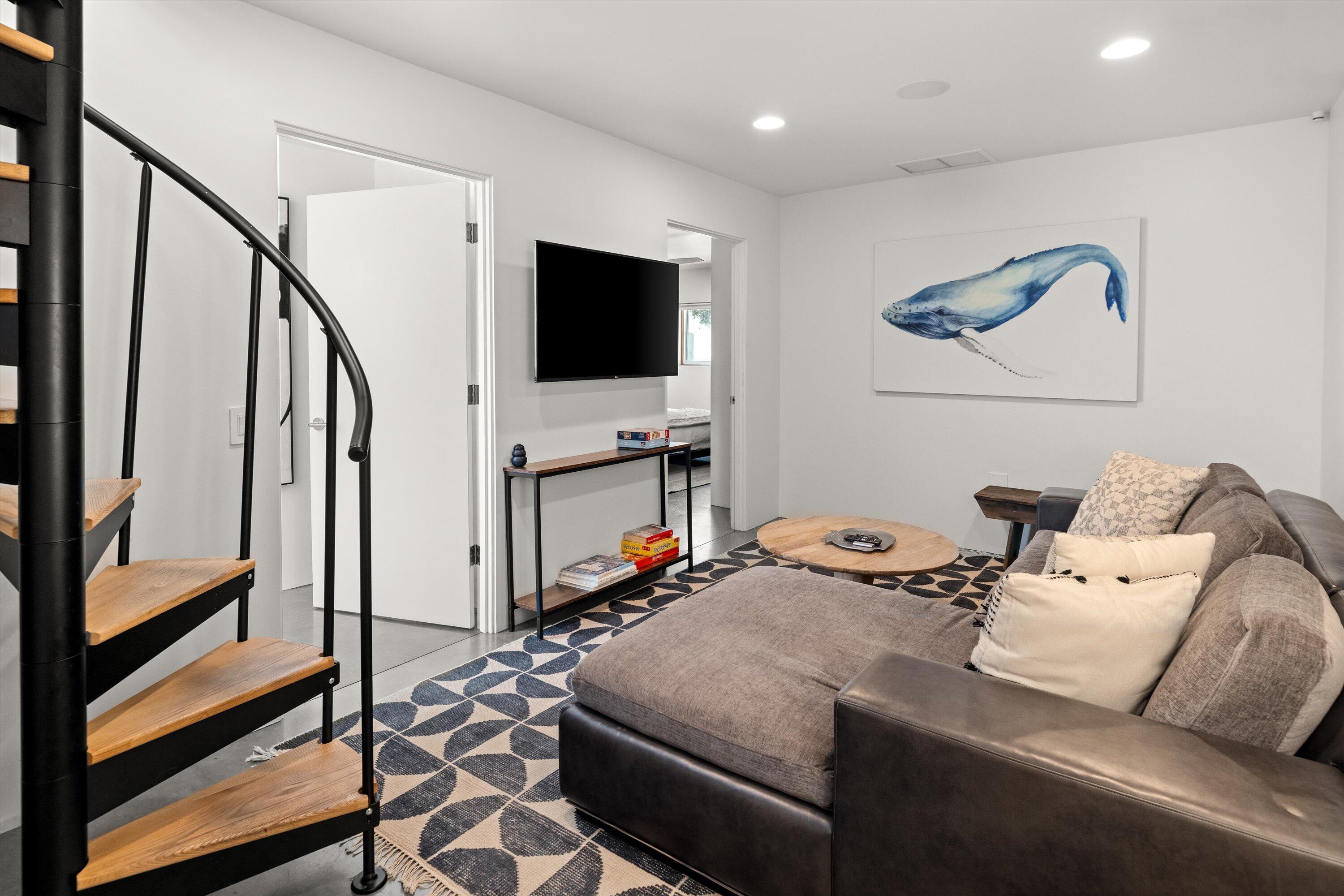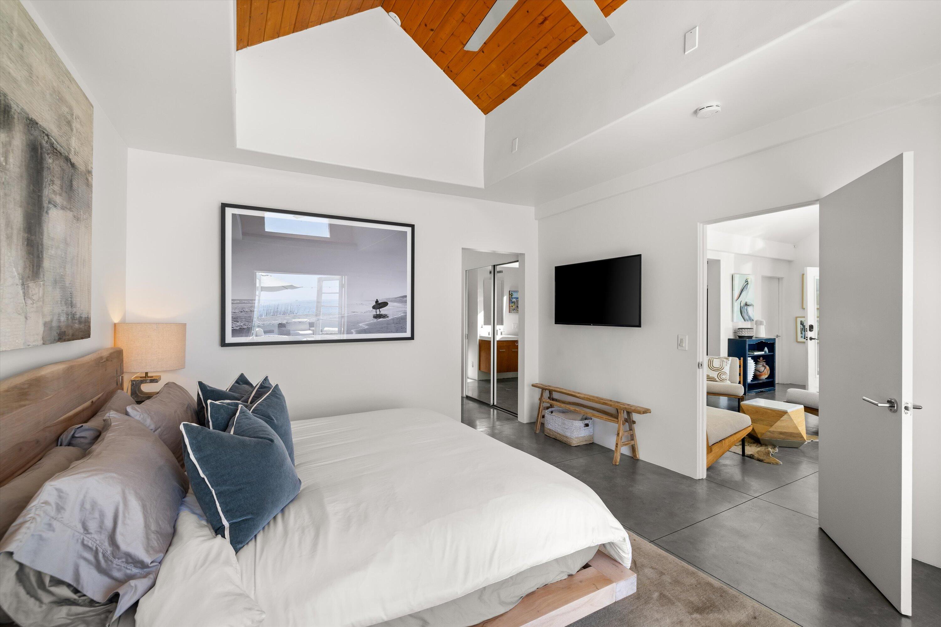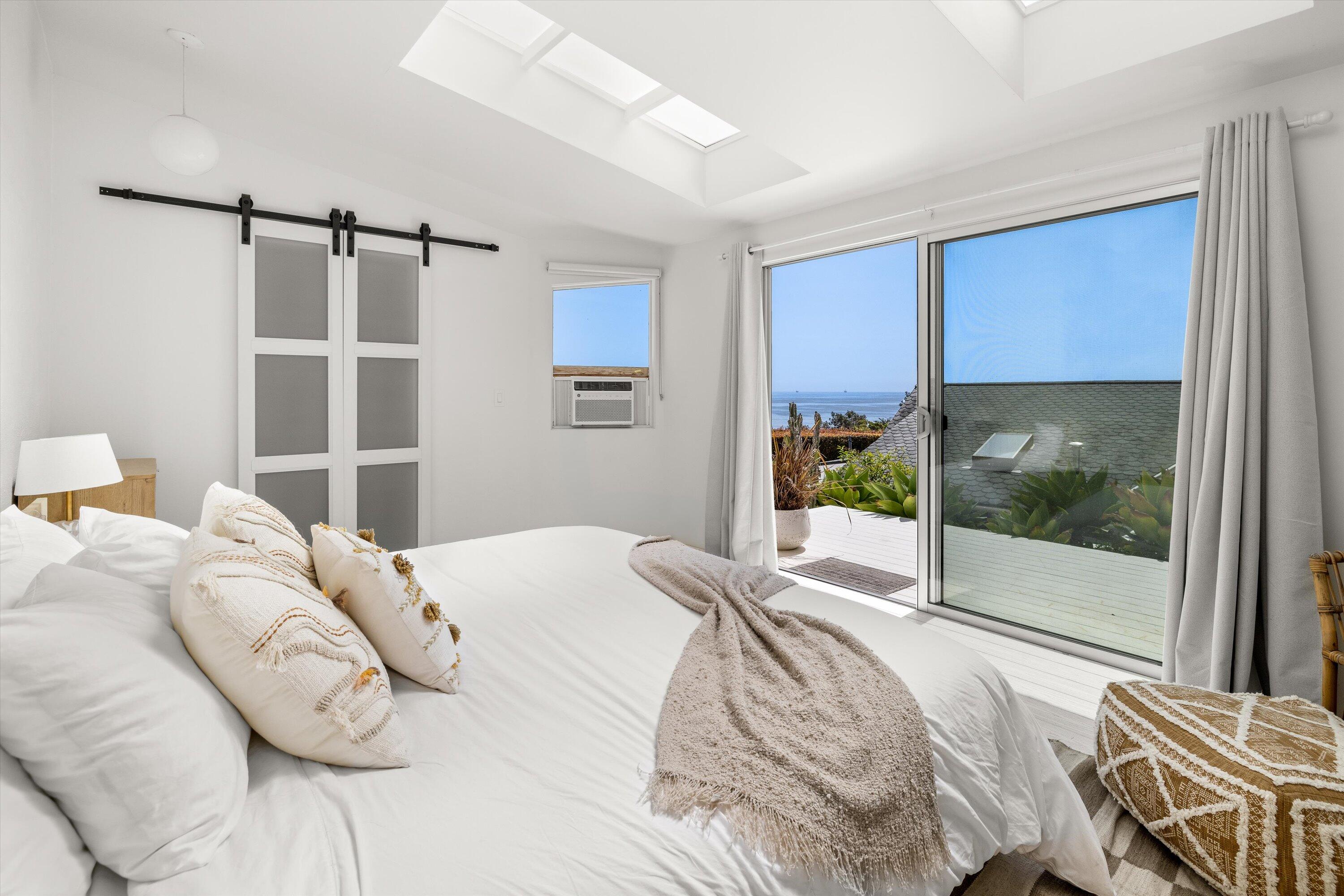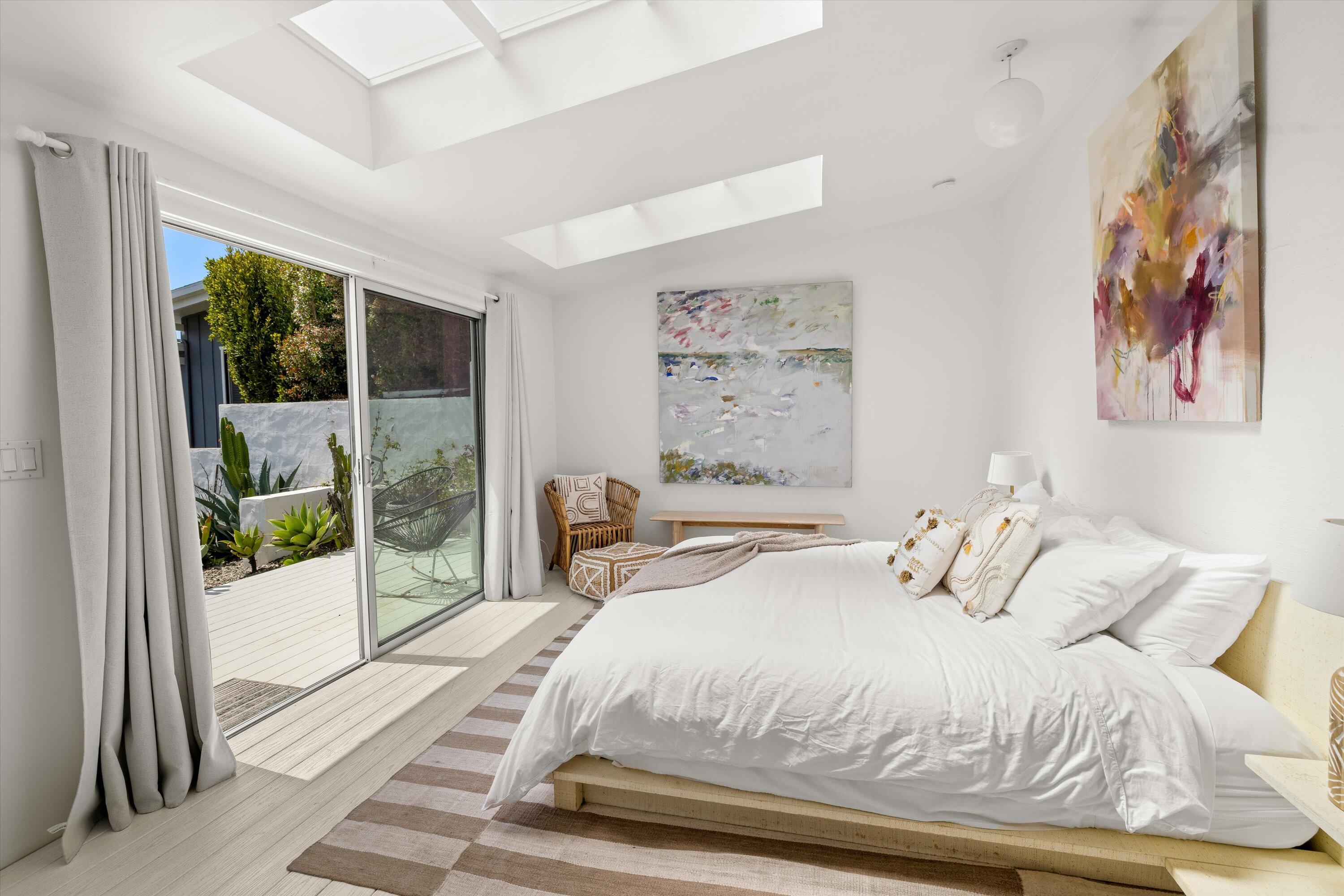 Inside, the 3/bed, 3.5 bath layout feels fresh and airy thanks to a renovated kitchen and a cozy lower level den. Vaulted ceilings with skylights and generous wrap around decks and patios make the most of the salty bre The lush gardens, private spa, and separate ocean-view art studio add to the home's unique appeal. Situated on a rare street-to-street lot, it also includes a two-car garage and plenty of off-street parking.