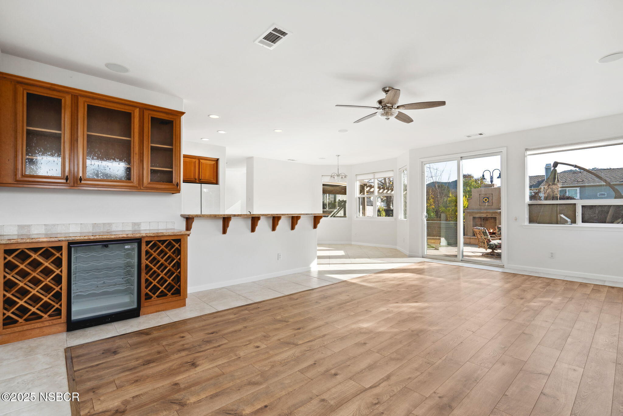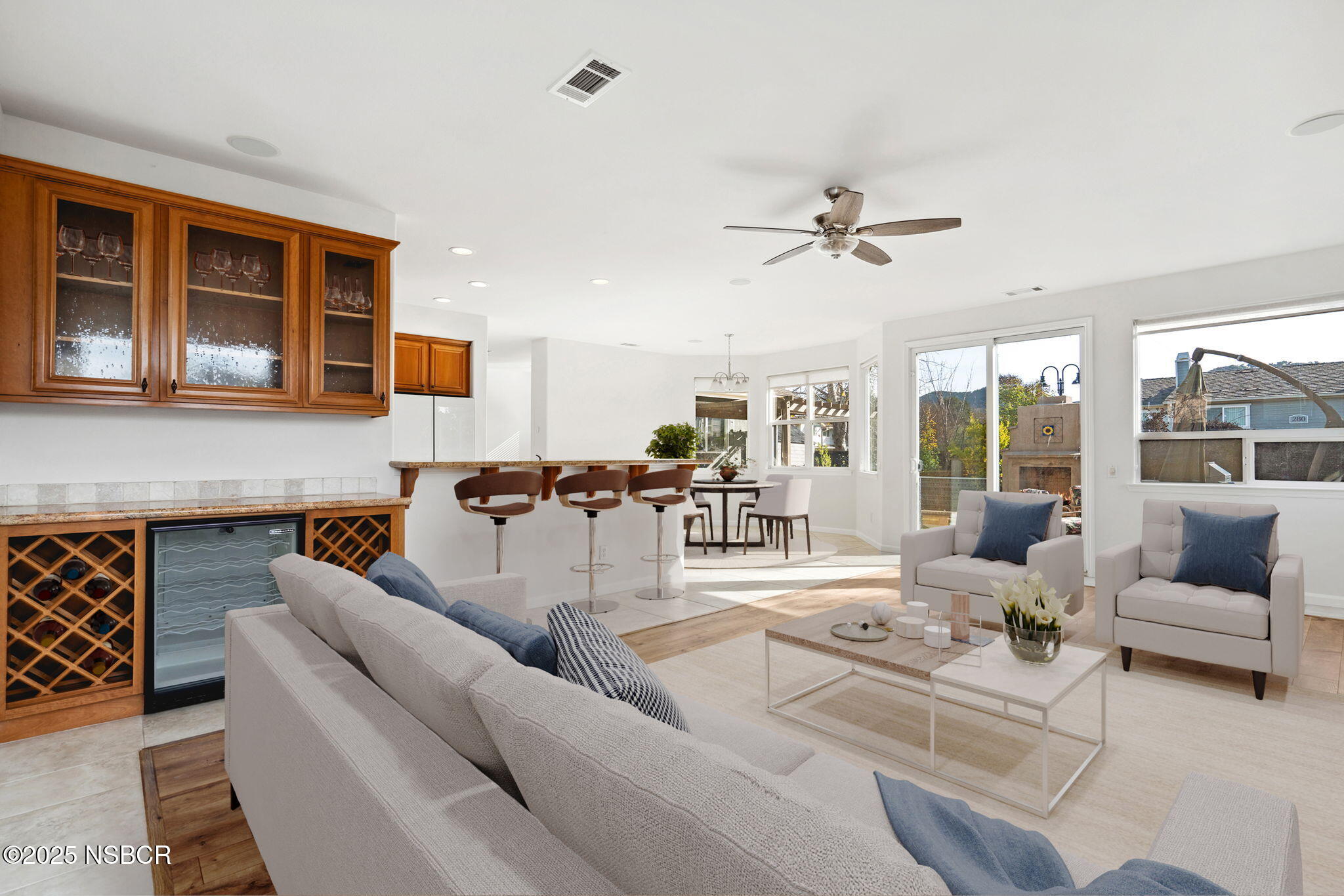 Located in a peaceful neighborhood in the heart of wine country, this spacious turnkey home was originally crafted as the community's model residence and comes equipped with premium upgrades you won't find elsewhere. Fresh interior and exterior paint provide a warm welcome, while newer flooring on both levels has been chosen in a modern, neutral palette that coordinates perfectly with the home's elegant finishes.The expansive main level features multiple living areas, including a formal living space that seamlessly flows into the dining room and a convenient downstairs bedroom with nearby access to a full bath. The well-appointed kitchen boasts granite countertops, new appliances, and solid oak cabinetry, along with a peninsula for extra seating. Adjacent to the kitchen, you'll find a custom built-in bar complete with a wine fridge, bottle storage, and additional cabinetry.Unwind by the cozy fireplace in the secondary living room and take in sweeping vineyard views. Step outside to enjoy the tranquility of wine country from your private spa, located next to a fully equipped outdoor kitchen. Upstairs, you'll find three spacious bedrooms, including a luxurious primary suite with a separate sitting room featuring tray ceilings, another fireplace, an expansive bathroom, and a generous walk-in closet. Additional upstairs highlights include a guest bathroom with dual vanity and a laundry room featuring custom cabinetry and a deep basin sink.