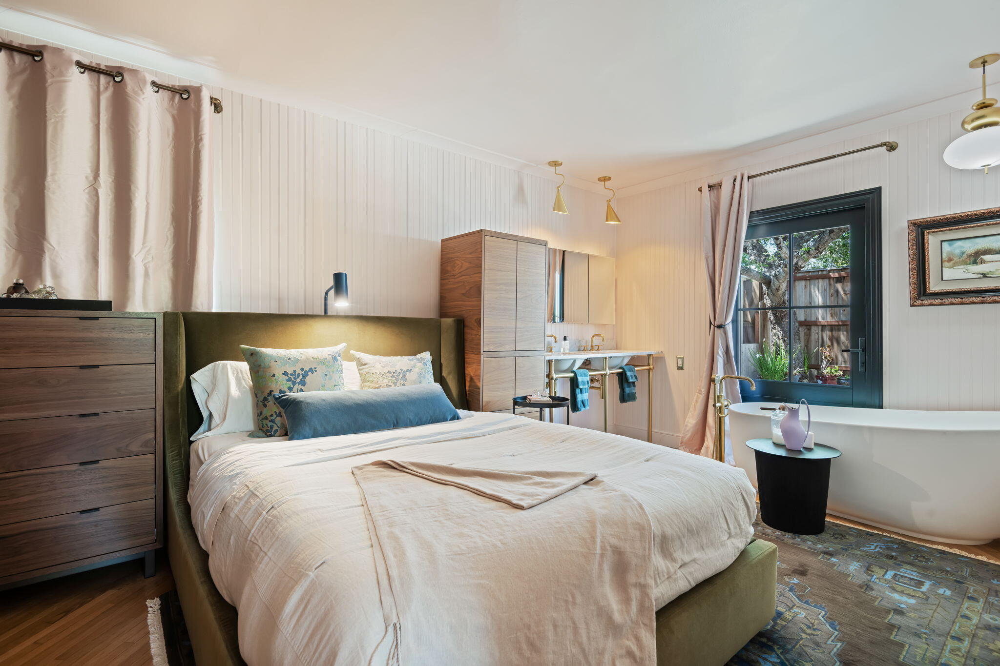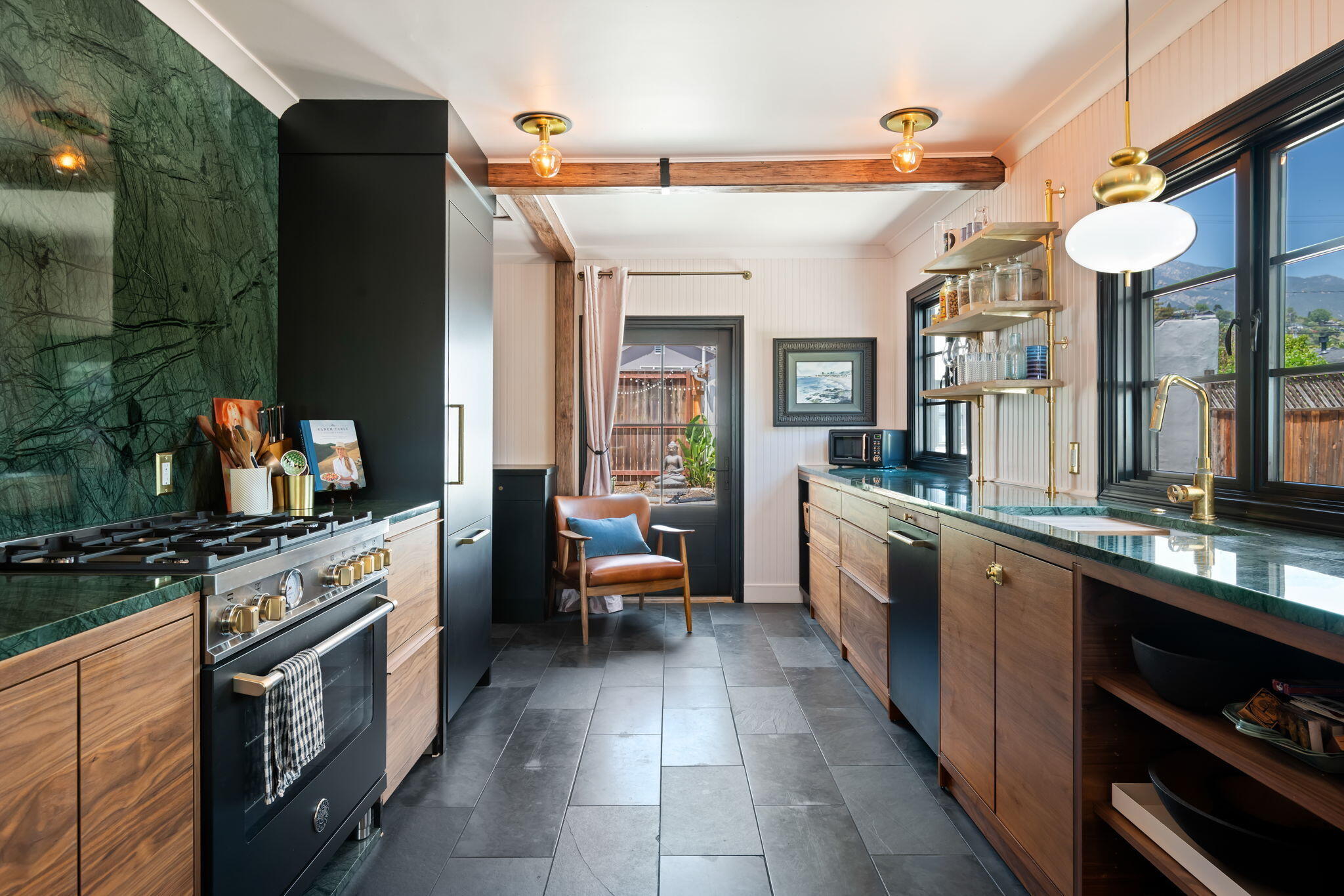 Description: This romantic, single-story San Roque cottage (+ a fully permitted ADU) evokes feelings of nostalgia while providing all the modern conveniences. The updated kitchen features exquisite Verde Guaco Marble finish, custom cabinetry, Bosch built-in refrigerator & dishwasher, Bertozzi dual-fuel range, unlacquered brass plumbing fixtures and hardware, a deep single-basin sink with custom fittings, open walnut shelving, and slate floors. Sleek wine storage and a coffee bar further enhance this thoughtfully designed kitchen. Both bathrooms in the main house are finished with Verde hex tile, marble floors, zero entry showers, a deep soaking tub in the primary, and finishing touches reminiscent of the 1930's era of the home. The 3b+2ba cottage has original finished hardwood floors throughout, blush walls, warm lighting, silk-effect draperies, a continuation of the Verde Guaco Marble in the fireplace hearth, and black Windsor doors & windows bring sunlight through all four sides of the home. There is even space for a separate office pop-out adjacent to the dining area. The front garden welcomes you through a trellis into a lush courtyard with climbing roses, jasmine, mature hedges, and dwarf nectarine, mandarin, apple & avocado trees. The property has a stunning ADU garage conversion with a finished kitchen, bath, laundry, cozy sleeping & entertaining space. This soulful home is filled with intentional design. Located in the San Roque neighborhood of Santa Barbara close to Peabody Elementary, the Natural History Museum, scenic walking trails, healthcare facilities, shopping, and dining.