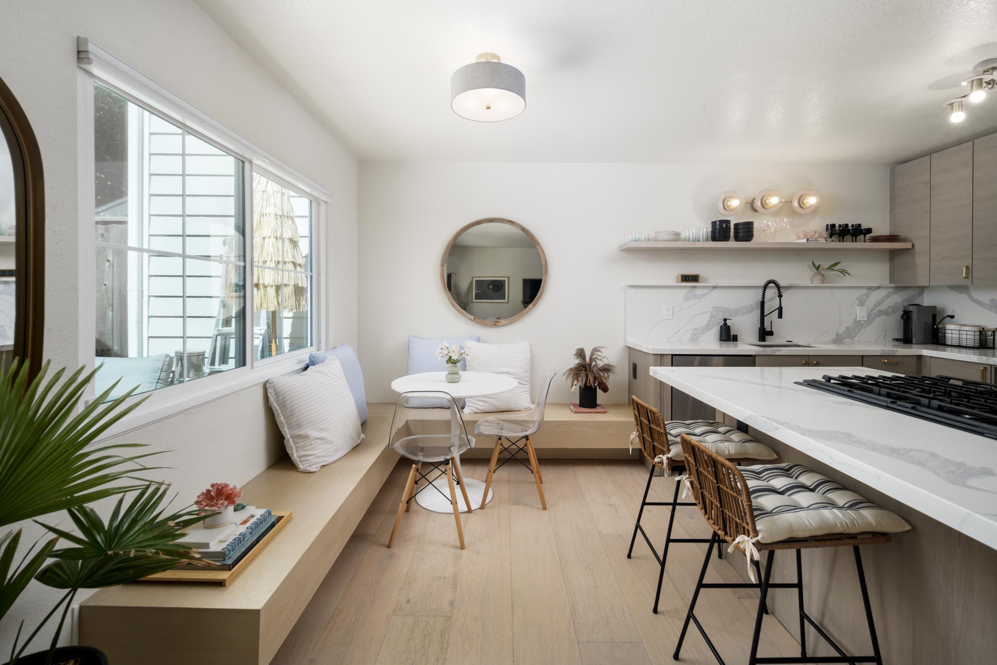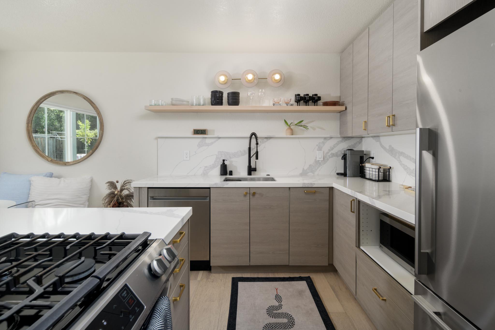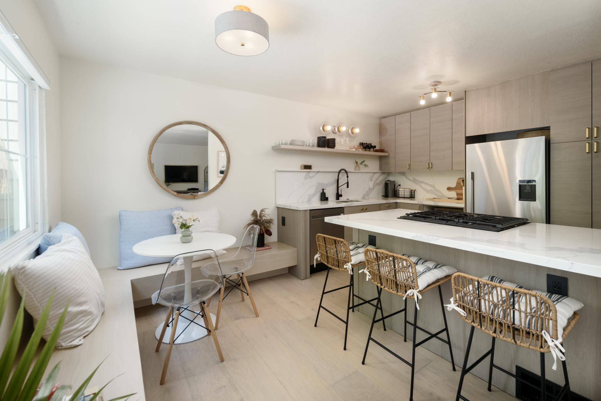 This beautifully renovated 2-bedroom, 1.5-bathroom townhome, spanning 1,104 sq ft, is situated in the sought-after Hope School District. The home boasts numerous upgrades, including a brand-new kitchen with modern appliances, custom cabinetry, quartz countertops, and a stylish banquette seating area. Additional improvements include new windows and doors, renovated bathrooms, wide plank oak flooring, updated lighting, new window coverings, a new furnace, and fresh paint throughout. The property also offers two assigned parking spots and an in-unit laundry room. Outside, the private backyard patio opens to a park-like greenbelt shaded by mature trees. Conveniently located near Los Robles Park, Hope School, restaurants, shops, and Upper State Street.