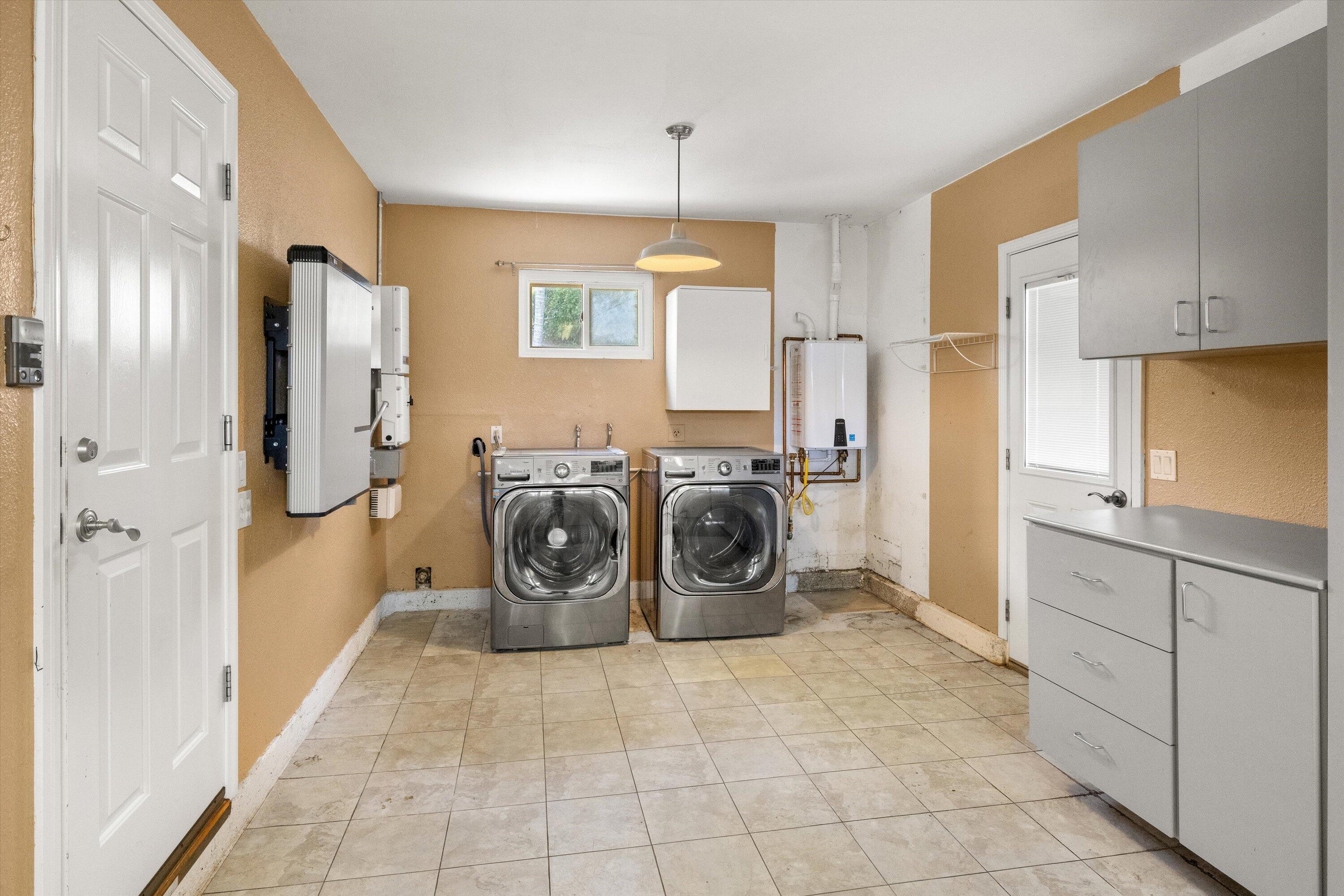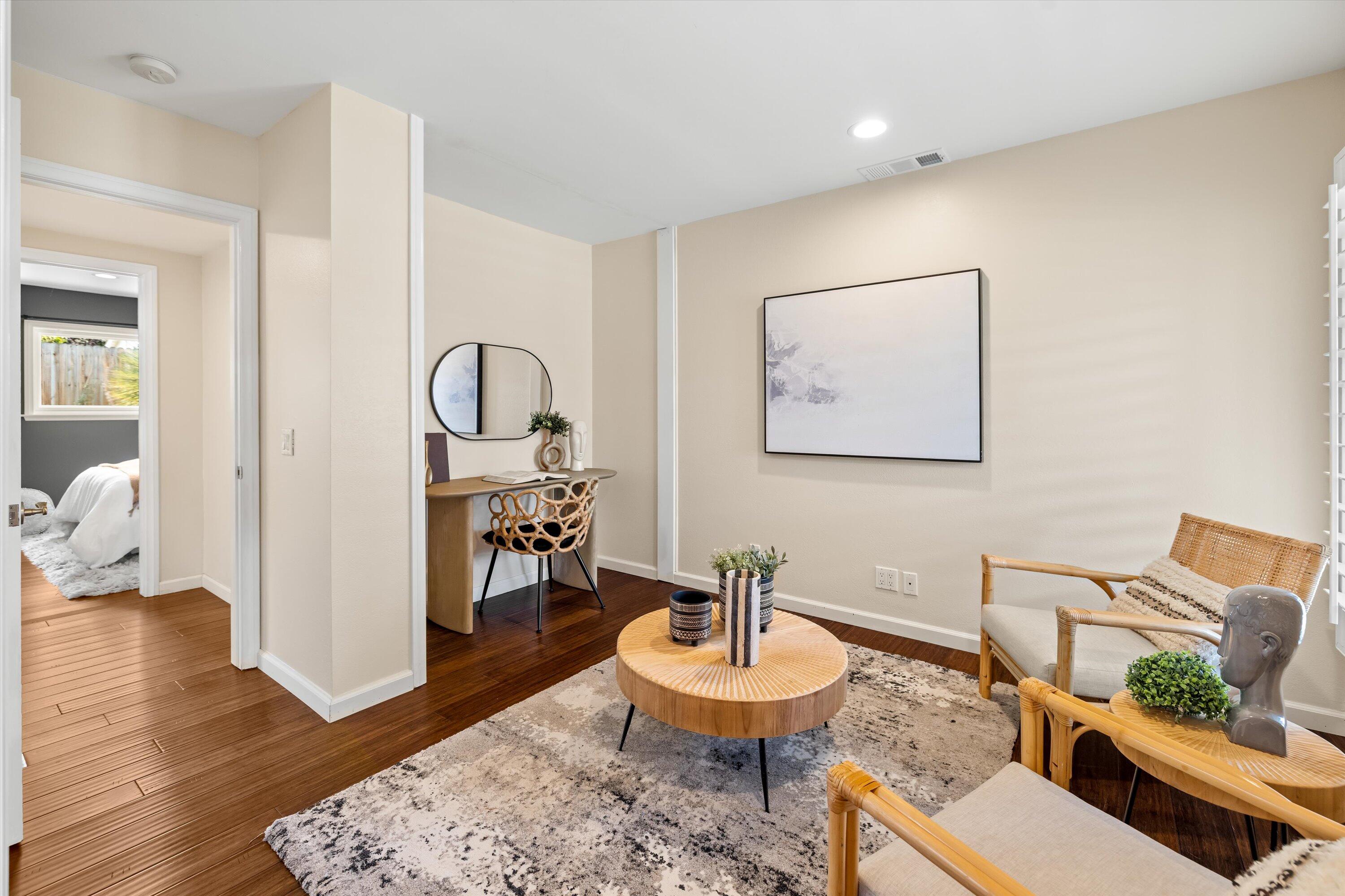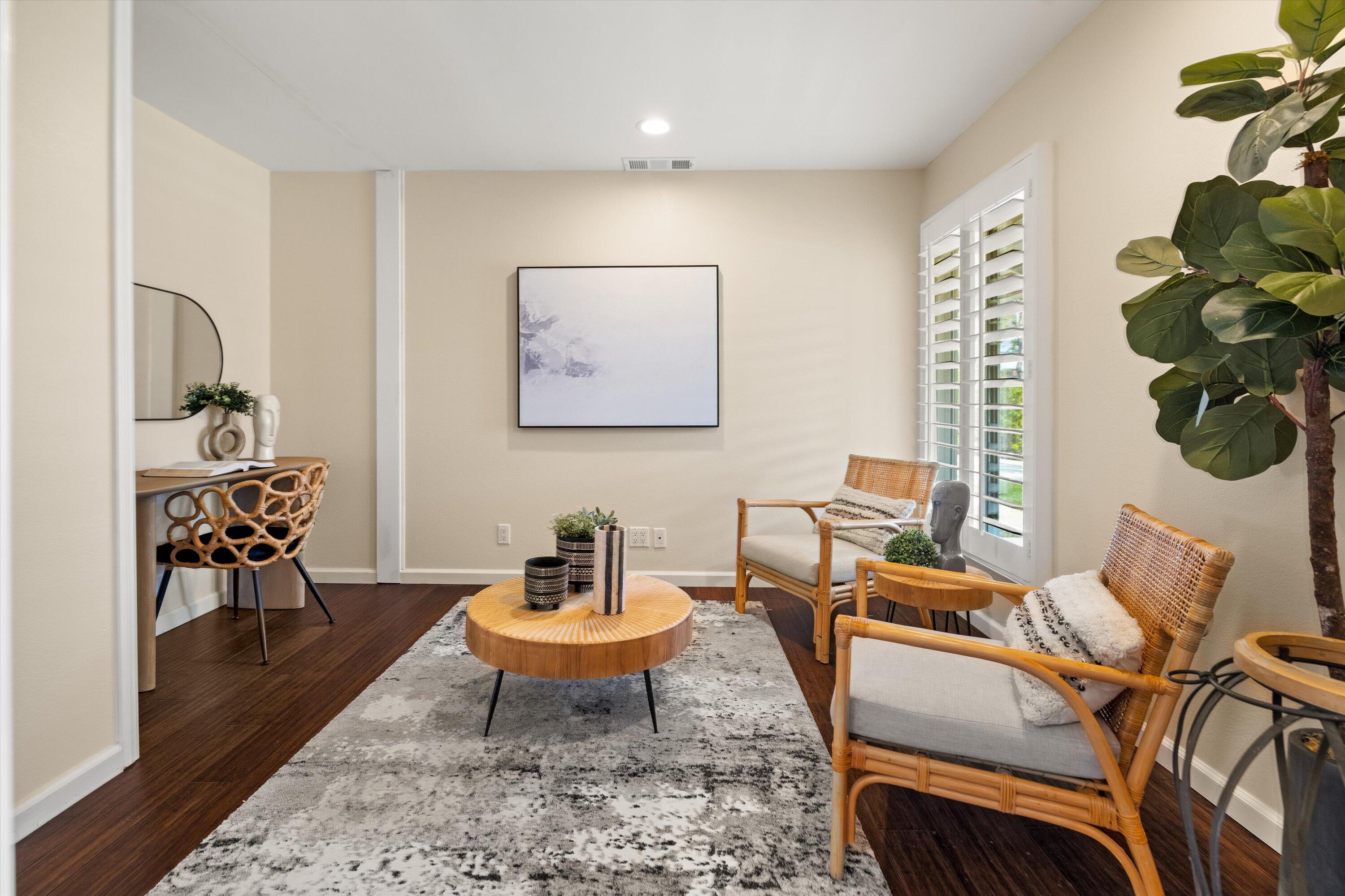 While the floor plan is open, it still provides definition of space, and walls for art. The primary suite retreat has a multi purpose bonus area and walk in closet. Natural light from a skylight enhances the primary bathroom, which also boasts ample counter space, dual sinks and a tiled shower. Other highlights include: Fenced yard with lawn, planting areas, fruit trees and patio space. There is an abundance of storage in the oversized two car garage, plus a fire rated, drop down ladder to the attic storage. Especially wonderful this week: Central Air conditioning! Owned solar, plus a power wall!